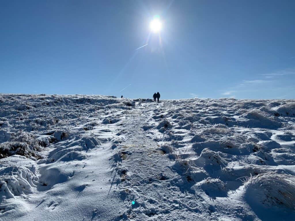 We decided to make a further short cut to avoid a very steep and narrow descent, but didn’t escape a serious (but fun) challenge through very thick drifted snow. The long finale lay ahead … I for one, was beginning to get the ‘vapours’ … with the thought of my beloved Red Lion, it eased the mileage.